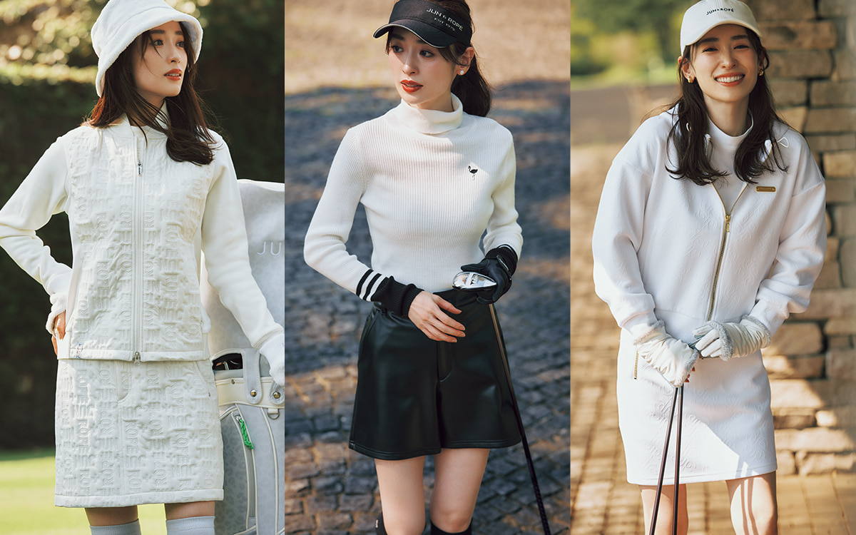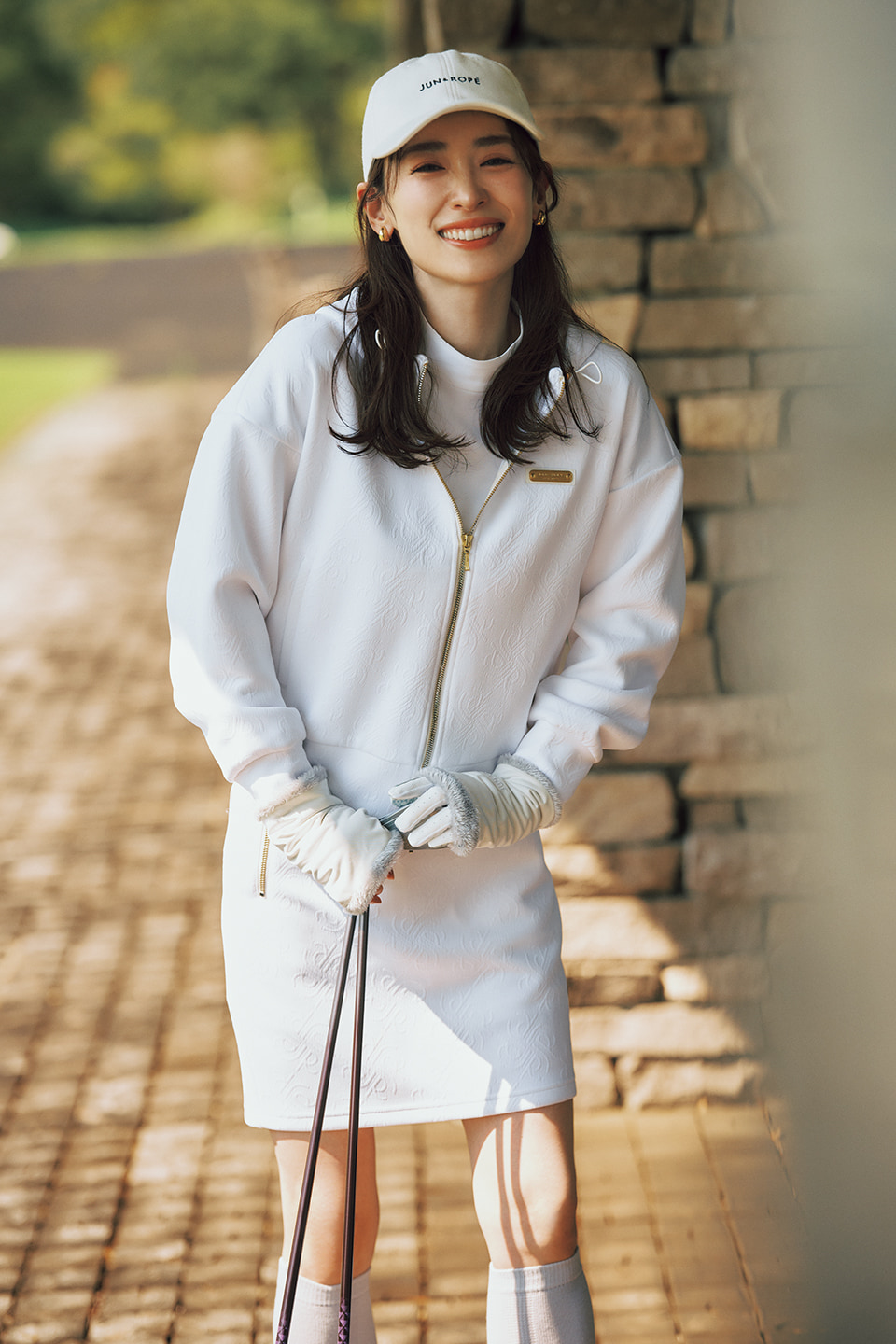 ベスト¥36,300・モックネック¥25,300・スカート¥27,500・キャディバッグ¥63,800・帽子¥10,450・ハンドカバー¥8,800(ジュンカスタマーセンター〈ジュン&ロペ〉) ソックス・グローブ/スタイリスト私物