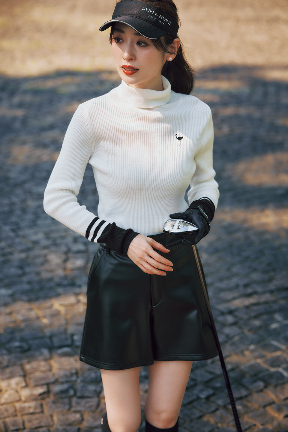 一見、ゴルフウェアに見えないその理由は、ほどよいリブ感ですっきりと見せてくれるタートルネック。袖にあしらわれた黒の配色も着映えするポイント。日常使いもできそうな上品な光沢感のレザー調のショートパンツと合わせれば、洗練された大人コーデが完成。シルバーのロゴがシャープなサンバイザーも辛口な印象に。
