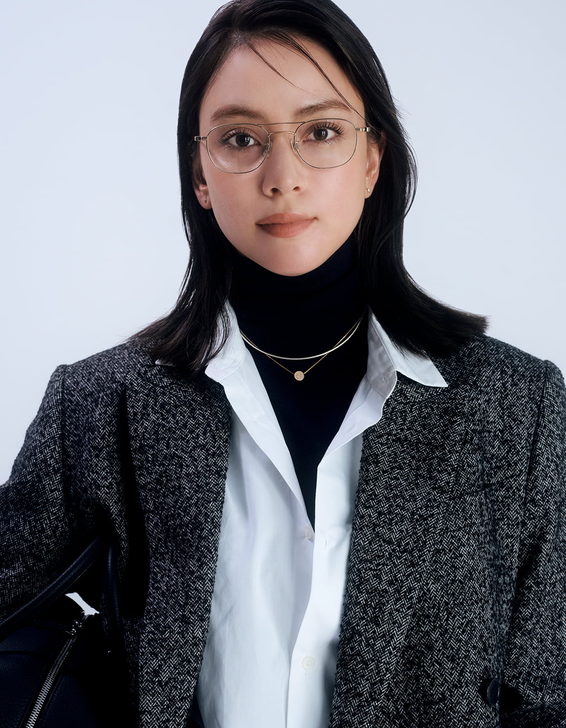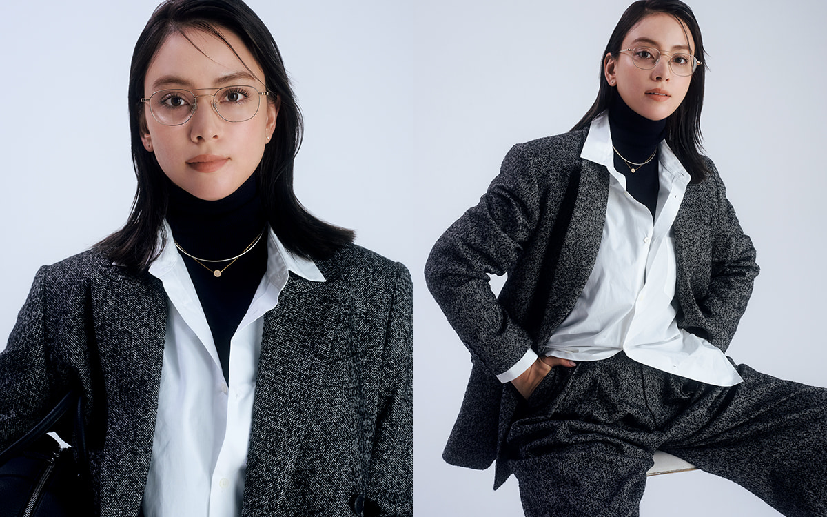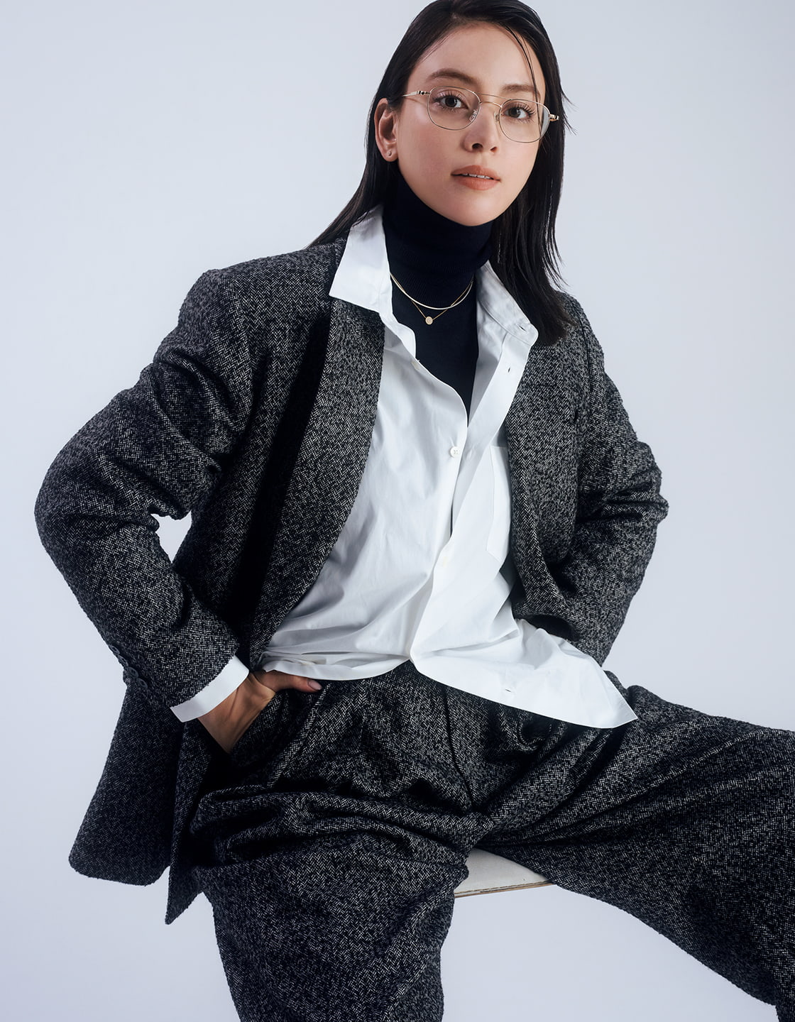 ジャケット¥108,900・パンツ¥49,500(インターリブ〈サクラ〉) シャツ¥36,300(エイトン青山〈エイトン〉) ニット¥29,700(ザ ショップ スローン 新静岡セノバ店〈スローン〉) バッグ¥174,790(ボナベンチュラ カスタマーサポート〈ボナベンチュラ〉) メガネ¥49,500(アイヴァン PR〈E5 アイヴァン〉)