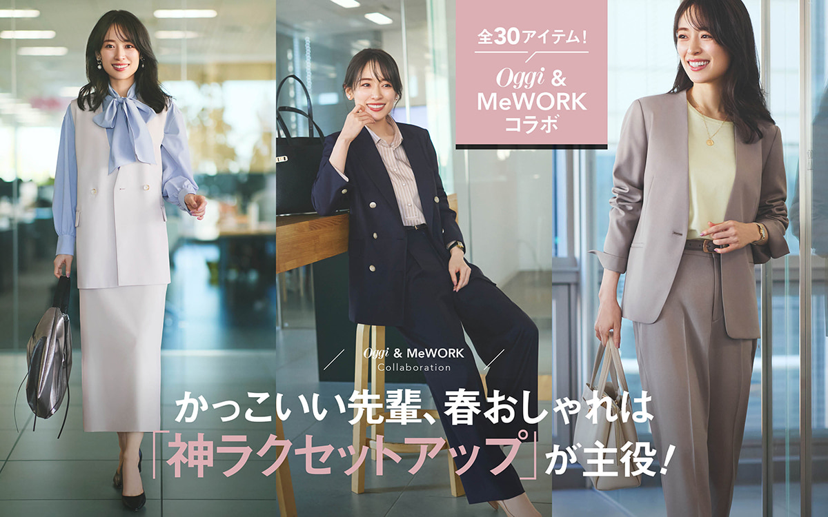 AOKIの〝MeWORK〟とOggiのコラボアイテムができました。働く女性の代表、Oggi専属読者モデル・オッジェンヌのリアルな声を反映し、セットアップ、トップスなど、全30アイテムがラインナップ。中でも、春のワードローブの軸となるセットアップは、〝MeWORK〟の特徴である高い機能性はそのままに、Oggiらしいきちんと感と洗練さを加味。春いちばんにチェックしたいアイテムです。