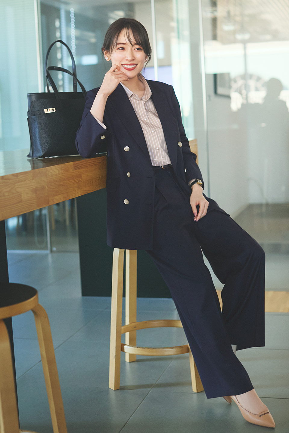 オッジェンヌたちからリクエストが多かったのがダブルブレストジャケット。中でもネイビーは「紺ブレっぽく着たい」との声があり、ボタンをメタル調にチェンジ。平日はセットアップでコラボシャツに合わせて、休日は単品で×デニムでも素敵。