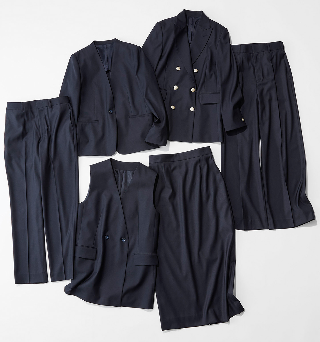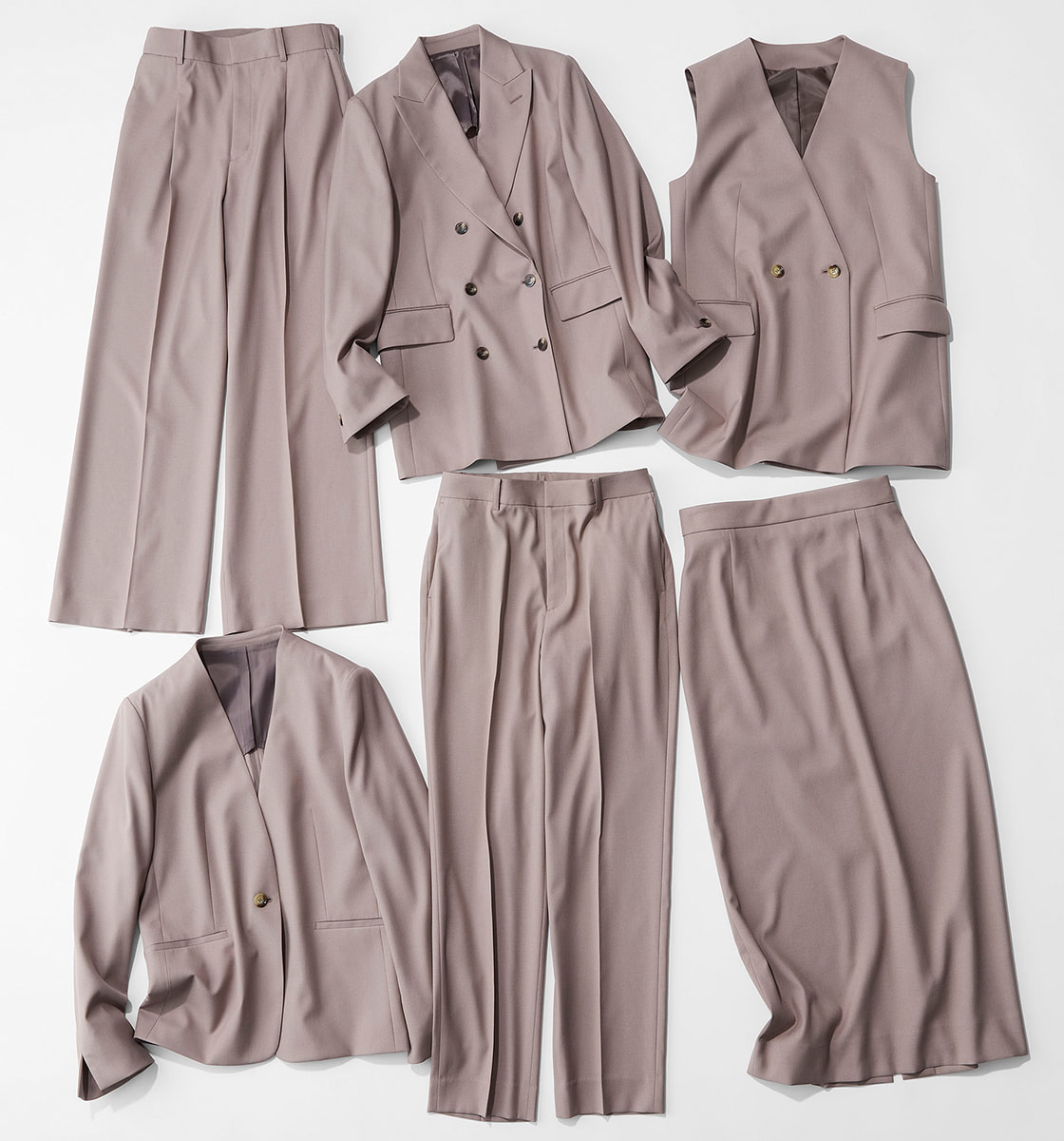 ダブルブレストジャケット¥28,490・ノーカラージャケット¥26,290・ジレ¥17,490・ワイドパンツ¥16,500・ストレートパンツ¥15,400・ロングスカート[発売店舗限定]¥14,300(AOKI)