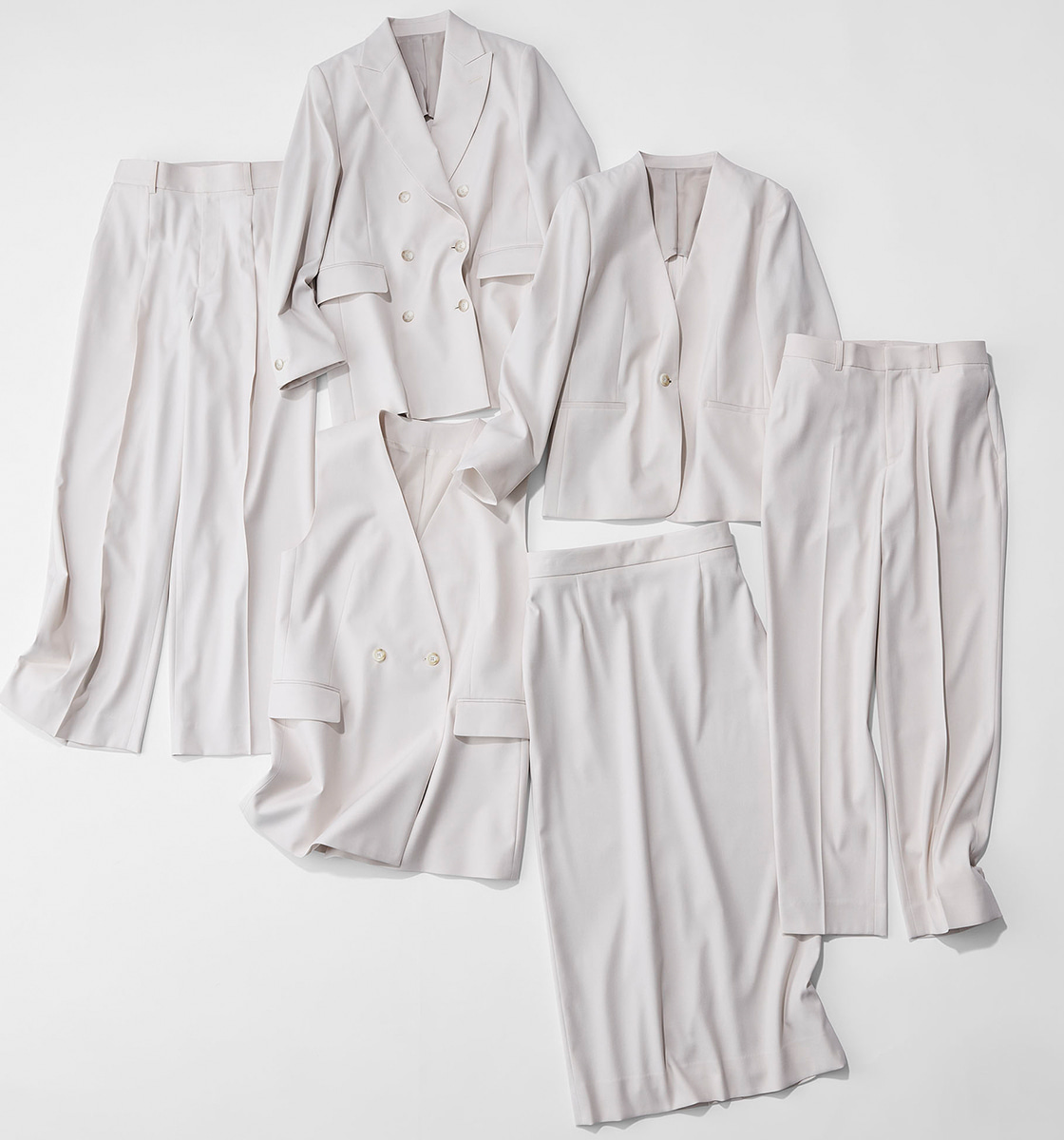 ダブルブレストジャケット¥28,490・ノーカラージャケット¥26,290・ジレ[発売店舗限定]¥17,490・ワイドパンツ¥16,500・ストレートパンツ¥15,400・ロングスカート[発売店舗限定]¥14,300(AOKI)