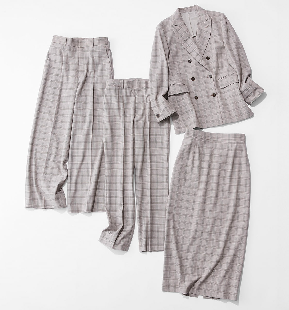 ダブルブレストジャケット¥28,490・ワイドパンツ¥16,500・ストレートパンツ¥15,400・ロングスカート[発売店舗限定]¥14,300(AOKI)