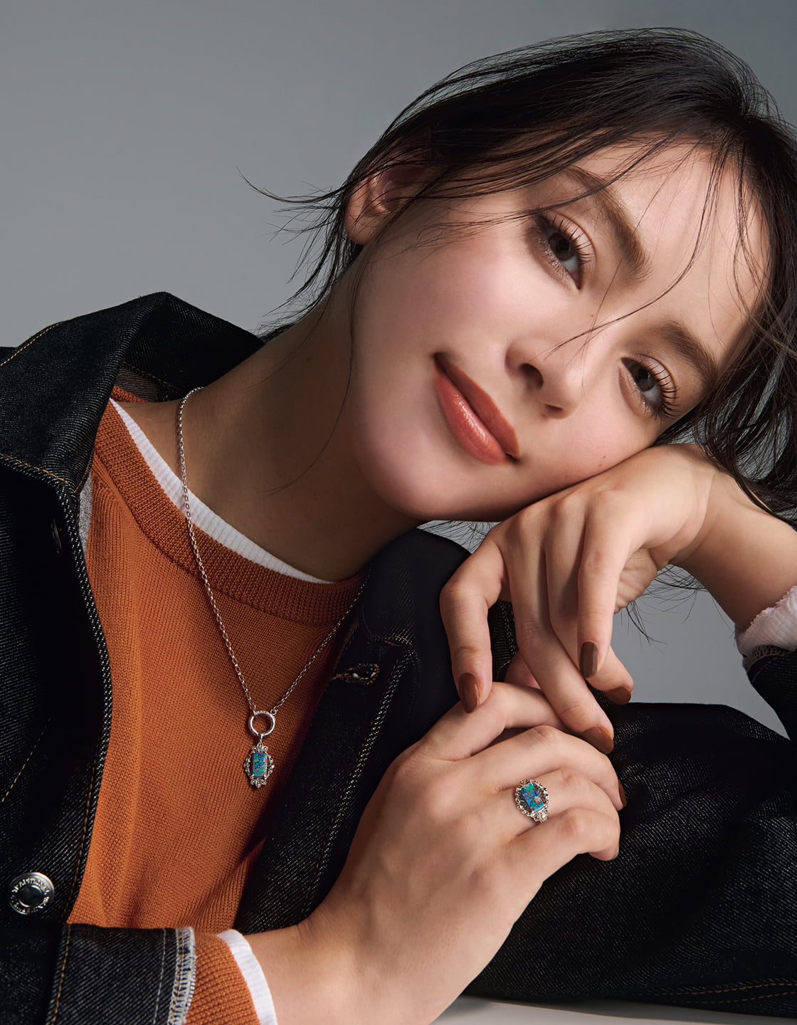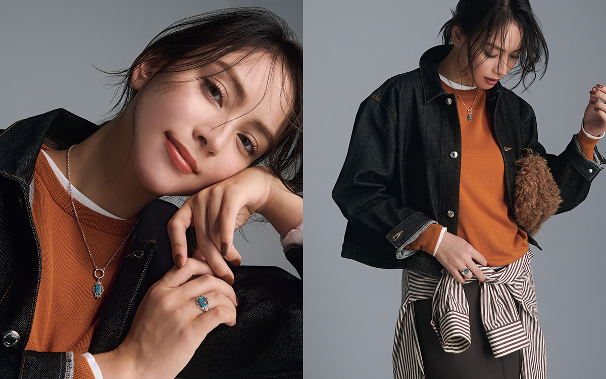 今季、大注目のデニムジャケットは、濃い色味を選ぶとクリーンな印象。そこに、プレイフルなデザインのジュエリーを効かせることで、ワンランク上の着こなしに。スクエアシェイプのモザイクオパールを、リーフと実をかたどった装飾が囲むネックレスとリングは、まるで絵画のような美しさ。角度によって色合いが変わり、多彩な表情を楽しめる。