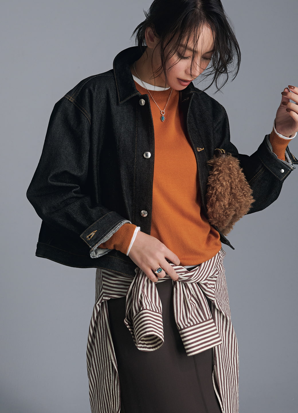 デニムジャケット¥39,600(トラディショナル ウェザーウェア渋谷店〈トラディショナル ウェザーウェア〉) ニット¥28,600(ザ ショップ スローン 新静岡セノバ店〈スローン〉) Tシャツ¥20,900・スカート¥49,500(エイトン青山〈エイトン〉) 腰に巻いたシャツ¥23,100(カデュネ) バッグ¥35,200(アンタイトル〈オルセット〉)