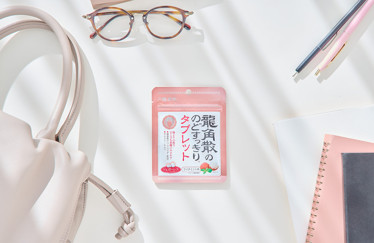 龍角散ののどすっきり飴も好きでよく食べています。飴って食べると割と長い時間口の中に残るじゃないですか? 電車や車での移動時間など乾燥する場所に長時間いるときは、本当に頼りにしています。でも、仕事のシーンだと人前に出るときや打ち合わせなど、飴が口に入っている状態だとモゴモゴして会話に支障が出ることや失礼に見えるかも? と気になることもあるから、サッと食べて口の中に残らないタブレットは、そういう場面でちょうどよくて。