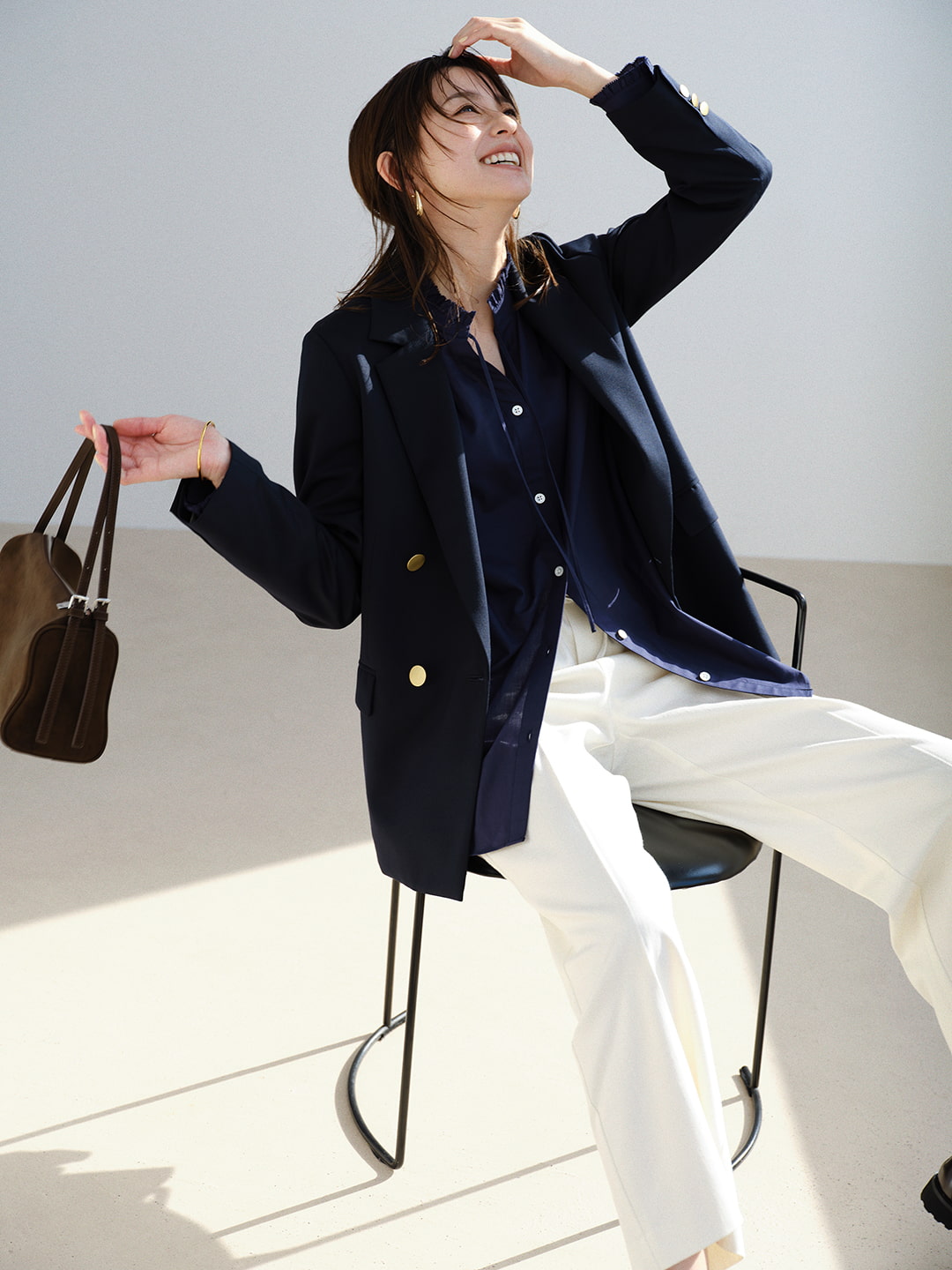 辛口派がこの春、真っ先に更新したいアウターのひとつが〝ジャケット〟。程よく肉感があるので、落ち感のあるゆったりシルエットでもきちんと感をしっかりキープしてくれる。だからこそ、仕事の日はきれいめに、休日はカジュアルに崩す、など振り幅のある着回しも難なくできるのが魅力。起毛感を抑えた上品な素材感なので、ロングシーズン着用できるのも高ポイント。ネイビーと白で全体をクリーンにまとめれば、かっこよさと清潔感が同時に手に入り、ワンランク上の知的な女らしさに仕上げてくれる。