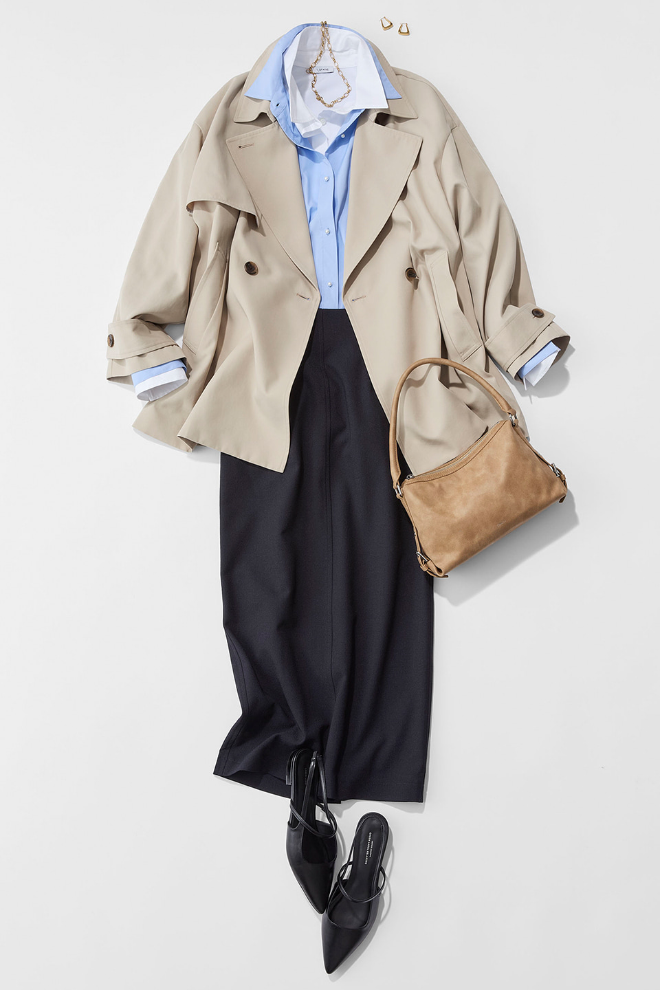 トレンチコートも、ロング丈からミドル丈へトレンドが移行中!裾に向かってふわっと広がるAラインシルエットは着こなしにエアリー感を加えてくれるので、辛口派の定番スタイルでもあるシャツ×タイトスカートのシャキッとした装いを一気に春らしい印象へと導いてくれる。腰位置よりも上についたフロントのダブルボタンは、目線をあげてスタイルよく見せてくれる効果も。程よいハリ感とドライな風合いもかっこよく、撥水機能も備わったまさに才色兼備な一枚。