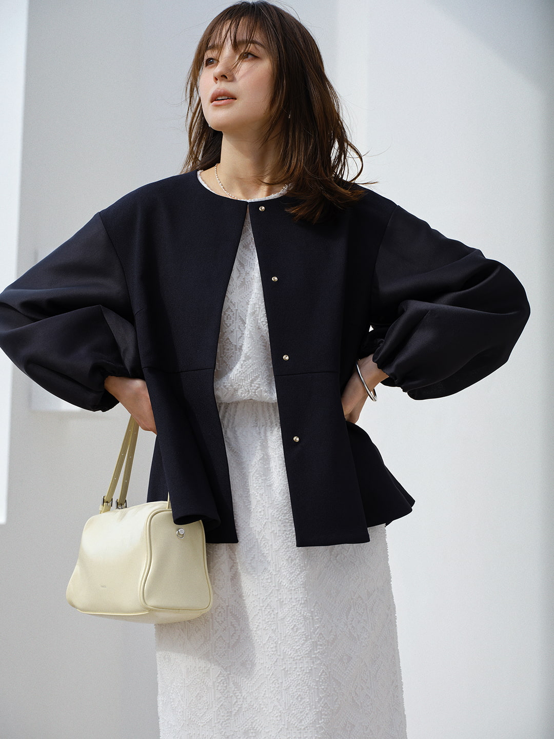 華やぎがありながらも印象のよさを大事にしたい甘口派がまず注目すべきは、一枚で十分サマになるノーカラージャケット。ボリュームのある袖×ペプラムシルエットの映えるフォルムだけでなく、ジョーゼット素材と光沢のある素材をドッキングした生地感もひと際目を引く。インナーを細身のワントーンでまとめても地味にならず、そのメリハリがかえってお互いの魅力を引き立ててくれる。