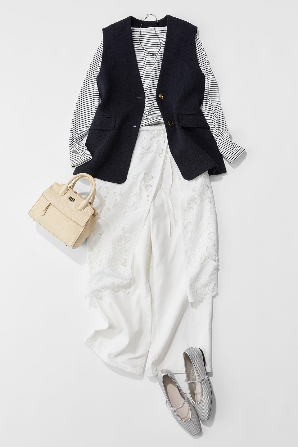 ツイードライクのナチュラルな風合いの生地で、かしこまりすぎずにラフに着られるジレは、この春1枚あると平日だけでなく休日もすごく便利!たとえば、白デニムパンツに巻きスカートを重ねた上級レイヤードスタイル。きちんと感のあるジレのおかげで大人っぽく引き締まるうえ、裾にかけて少し広がるナローシルエットで腰回りのもたつきをカバー。ゴールドボタンがアクセントになるので、アクセサリーが少なくても華やかに決まる。