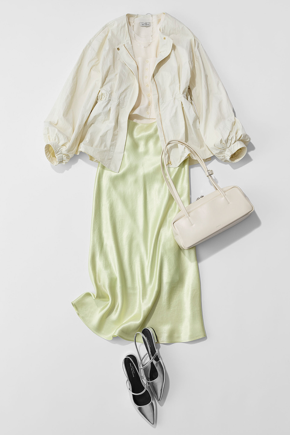カジュアルな印象が強いナイロンブルゾンですが、〝グリーンレーベル リラクシング〟の一枚は甘口派にぴったりなディテールが施されているのが最大の特徴。ウエスト内側のドロストを引けば、くびれができて簡単に立体感を演出することができる。また、前立てをつけることでファスナーの印象が軽減し、きれい見えを叶えてくれる。ほんのり光沢感があるからこそ、ツヤスカートやメタリックパンプスともまとまりよく仕上がって。