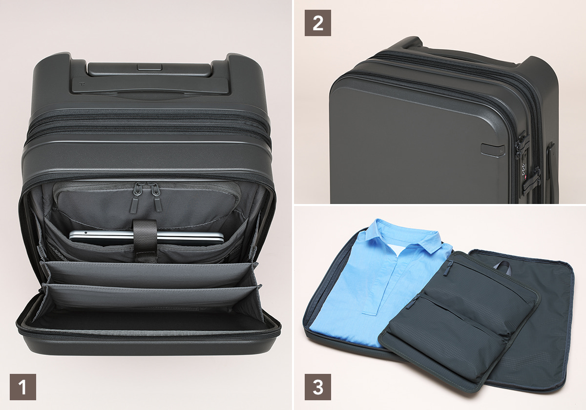 3 付属のコンパクトガーメントケース(H38 × W28 × D4cm)には、シャツなどの衣類を収納可能。ケース内のオーガナイザーパネルにジャケットを巻きつけて収納でき、型崩れを防止できる。パネルにはポケットも備え、小物の整理にも便利。ホテルではパネルをハンガーに吊るして使用することも。