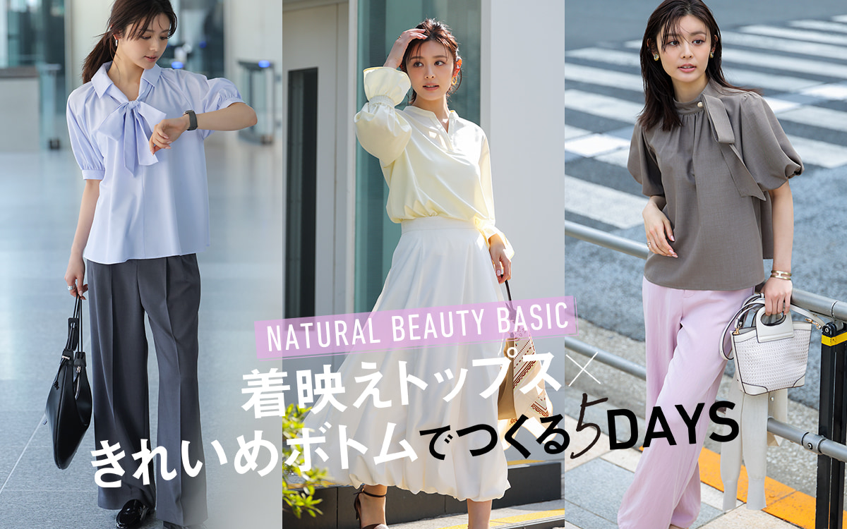 ついに春本番♡ いつも以上に華やかなおしゃれを楽しみたくなる季節だからこそ、「今日の私、地味すぎる…?」と悩んでしまうことも…。そんなときは〝NATURAL BEAUTY BASIC〟の着映えトップスに頼ってみて! きれいめシンプルなボトムを合わせるだけでサマになる多彩なトップスの数々を、5DAYSの着こなしとともにご紹介します。