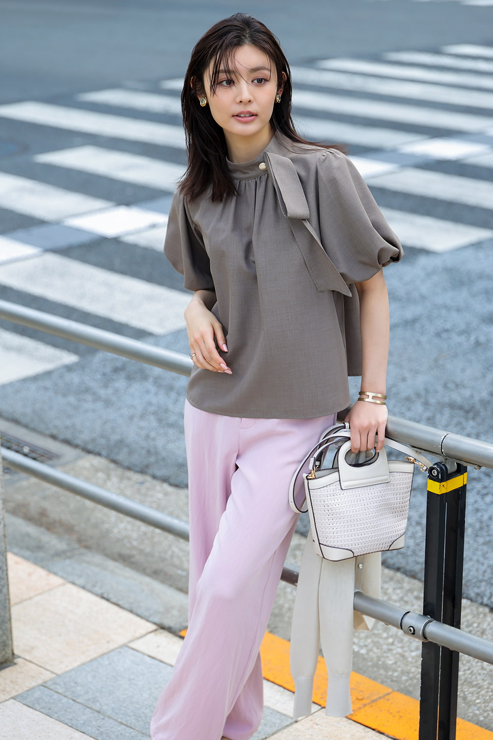 アフター7に予定がある日に選びたいのは、リボンを垂らしたようなタイデザインが印象的なバンドカラーのブラウス。ボリューミィなバルーンスリーブながら、顔まわりをシャープに彩るデザインでオフィスシーンも品よく。涼しげな表情のメランジ調素材も、洗練見えのポイント。春気分が高まるきれい色パンツとともに、おしゃれ感度の高さをアピールして。