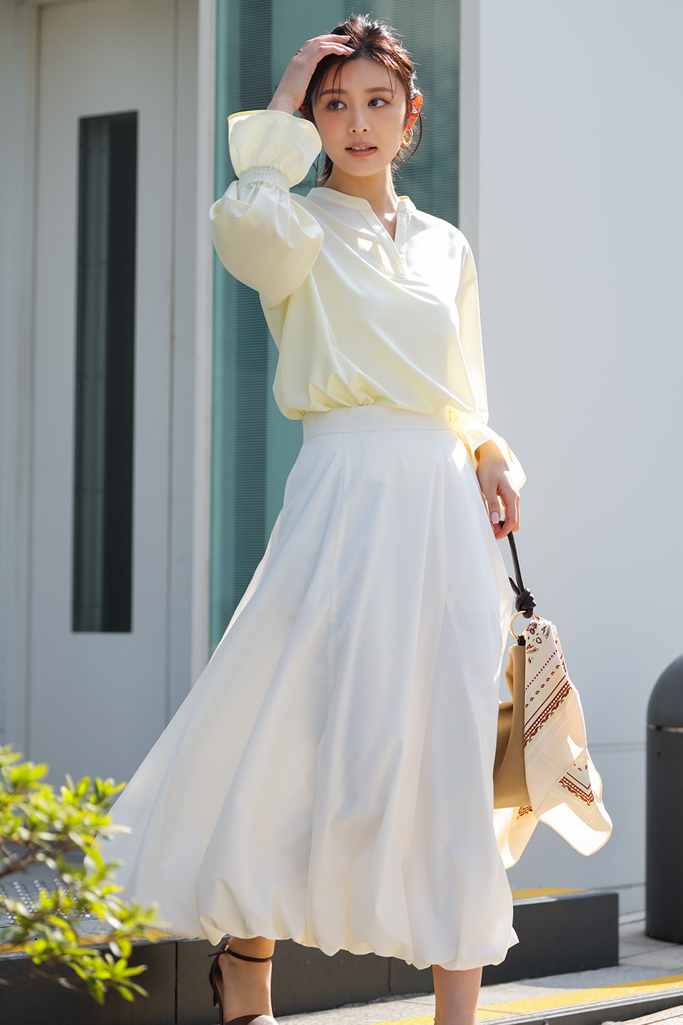 スカート¥10,989・バッグ¥7,997・バッグに巻いたスカーフ¥4,499・靴¥8,998(NATURAL BEAUTY BASIC) その他/スタイリスト私物