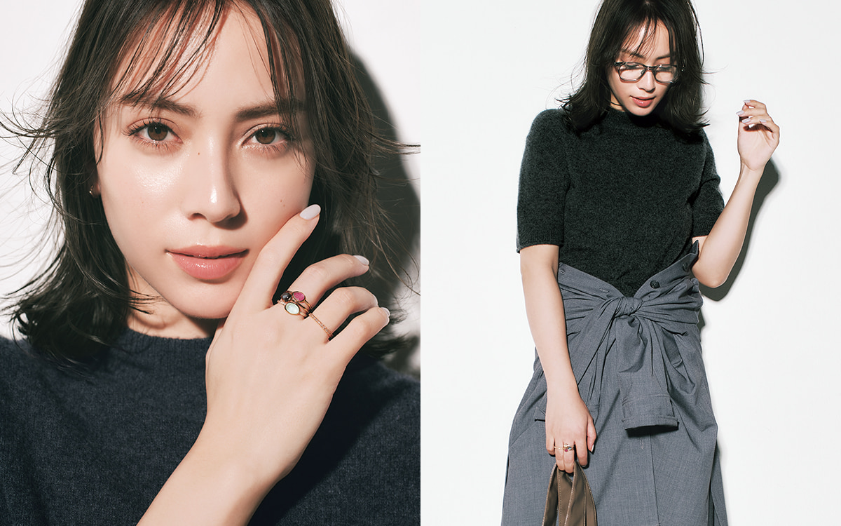 ベーシック服に〝アガット〟のジュエリーを掛け合わせた、スタイリッシュなアイディアを提案するこの連載の第44回。今回は、天然石ならではの色味を生かした、カラフルでチャーミングなリングがテーマです。
