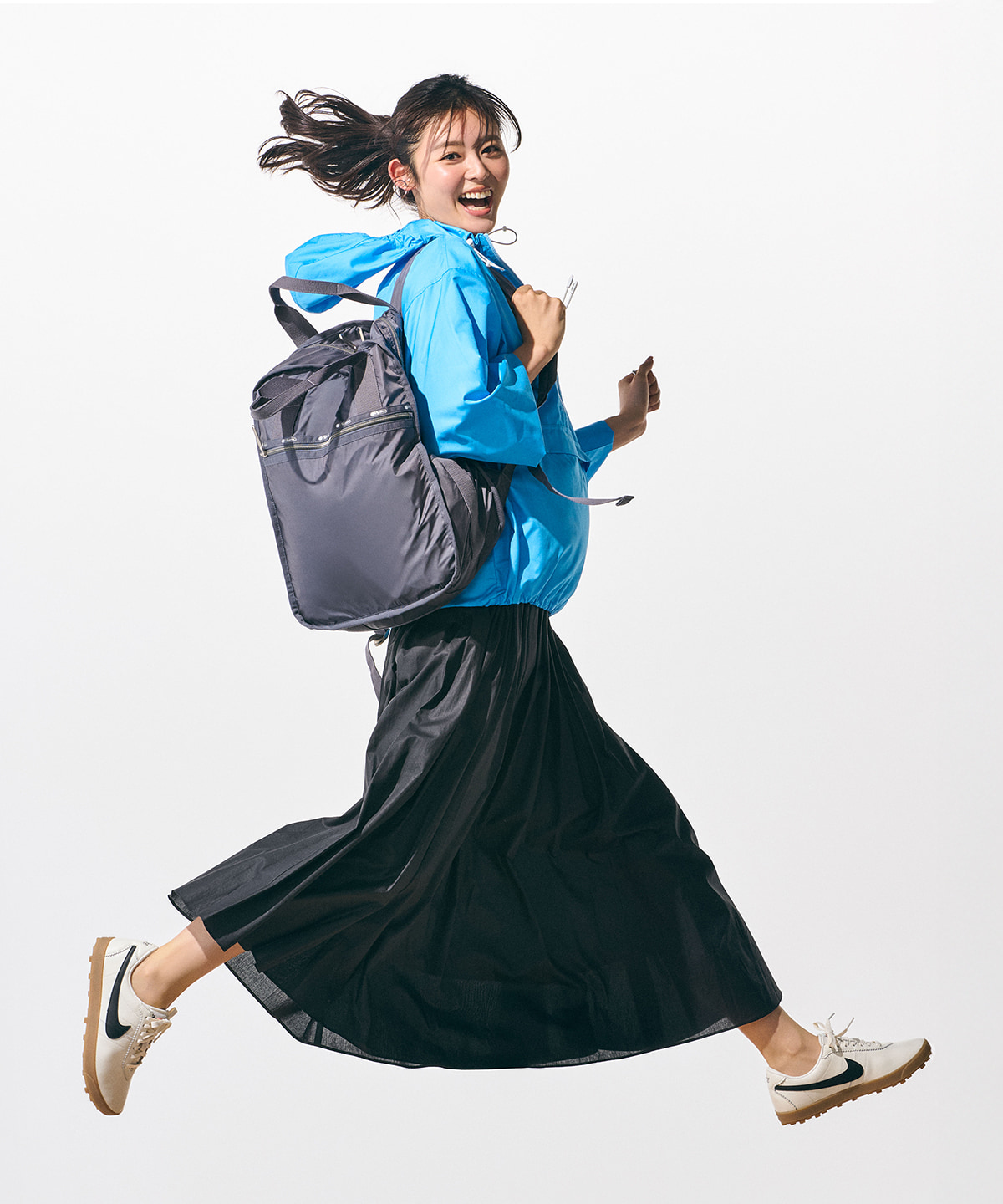 バッグ[42×30×16]¥29,700・ブルゾン¥27,500(レスポートサックジャパン〈レスポートサック〉) Tシャツ¥12,100(ワールド プレスインフォメーション〈クードシャンス〉) スカート¥11,990(オンワード樫山〈アンフィーロ〉) 靴¥15,730(NIKE カスタマーサービス〈ナイキ〉) ピアス¥37,400・リング¥55,000(マリハ)