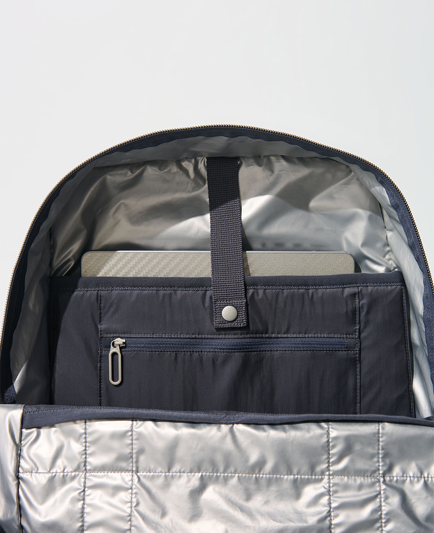 内側には14インチ程度のPCやタブレットを安全に保護するPC専用クッションポケットが。明るいシルバーになっているので、暗い場所でも中身がひと目で見つかるのも高ポイント! ほかには、両サイドにはマイボトルや折りたたみ傘が入るポケットやすぐに取り出したいスマホや名刺入れが入れられる外側のフロントジップなど、計7つのポケットを搭載。
