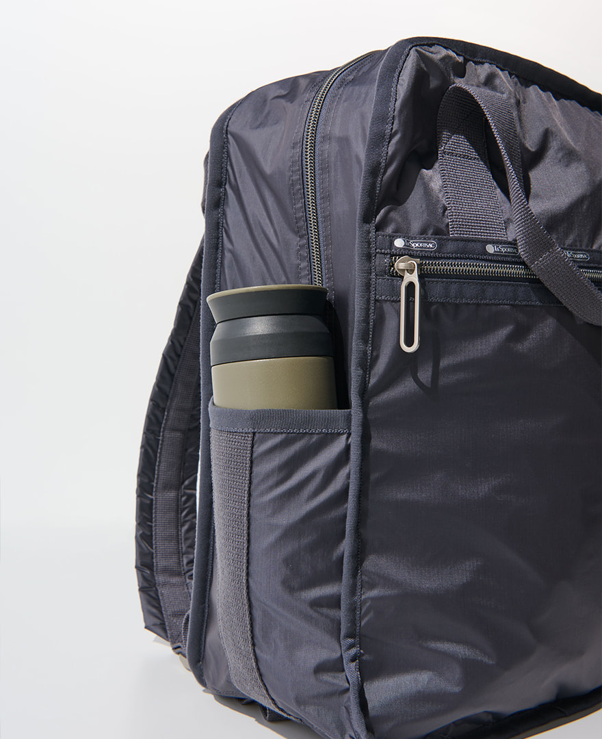 新・通勤バッグとしてのポジションを確立したバッグパック。選び方によってはどうしてもカジュアルになりすぎたり、子供っぽく見えたりしがち。ですがレスポのバックパックはミニマルな四角いフォルムと上質な素材感で〝ビジネスシーンでも浮かないバッグ〟として、すでに大評判! 上部にはしっかりとしたハンドルがついているので、電車内や商談先、あるいは「少しきちんと見せたい」場面ではサッとトートバッグのように手持ちにシフトできるんです。