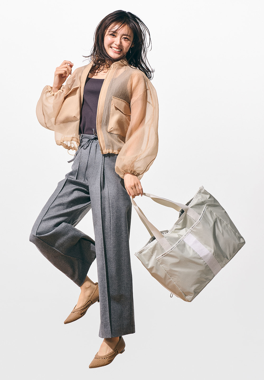バッグ[36×42×16]¥29,700(レスポートサックジャパン〈レスポートサック〉) ブルゾン¥16,500(ミラ オーウェン ルミネ新宿2店〈ミラ オーウェン〉) 中に着たタンクトップ¥3,990(オンワード樫山〈アンフィーロ〉) パンツ[共布ベルト付き]¥22,000(ánuans) 靴¥26,400(銀座かねまつ6丁目本店〈銀座かねまつ〉) ピアス¥136,400(ヴァンドーム青山 プルミエール 伊勢丹新宿店〈ヴァンドーム青山〉) ネックレス¥253,000(ヴァンドームヤマダ〈ケンゴ クマ プラス マユ〉)