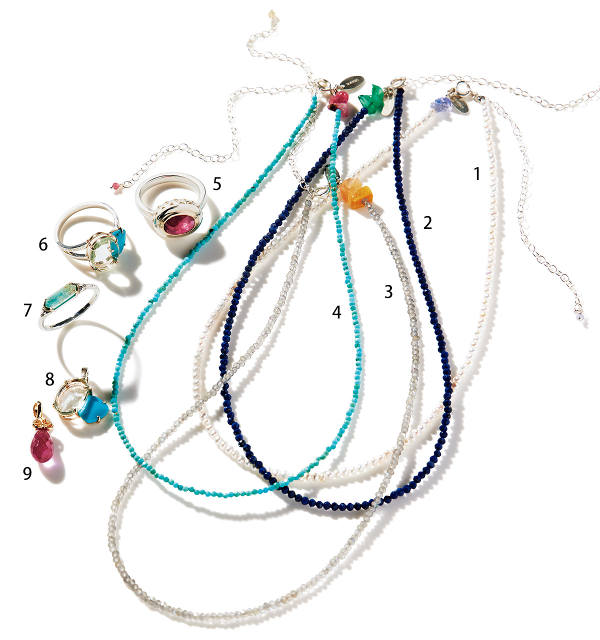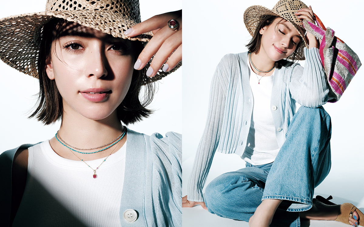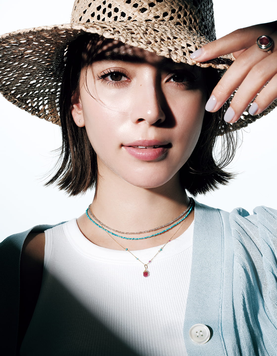 待ちに待った、過ごしやすい季節! つい手に取りたくなるのは、爽やかな色味のカーディガン。ほんのり透け感のある素材でライトブルー、さらにクロップド丈の一枚なら、コンサバに転びすぎず、軽やかな印象に。そこへ、ターコイズとルビーがリズミカルに並んだネックレスや、小粒のターコイズがびっしりと連なるネックレスを合わせて。鮮やかなブルーと赤のコントラストが、自由でエッジィなムードを連れてくる。