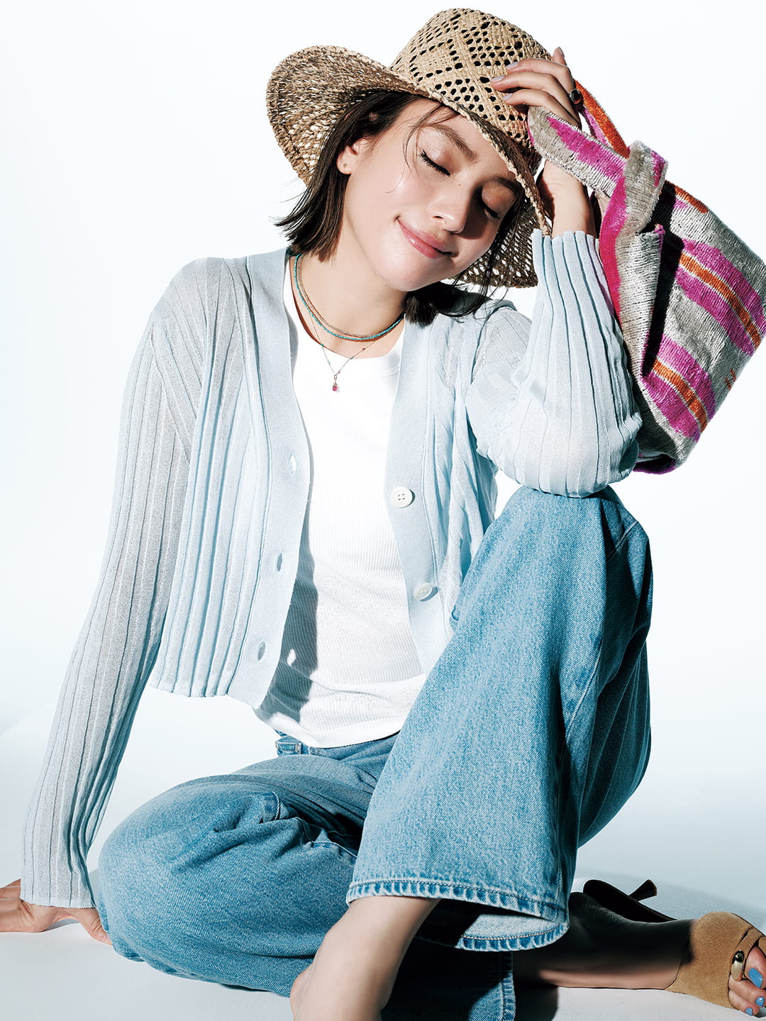 カーディガン¥30,800(ザショップ スローン 新静岡セノバ店〈スローン〉) タンクトップ[カップ付き]¥3,300(ヘインズジャパン カスタマーセンター〈ヘインズ〉) バッグ¥30,800(フラッパーズ〈キリムアーツ〉) デニムパンツ・靴・帽子/スタイリスト私物